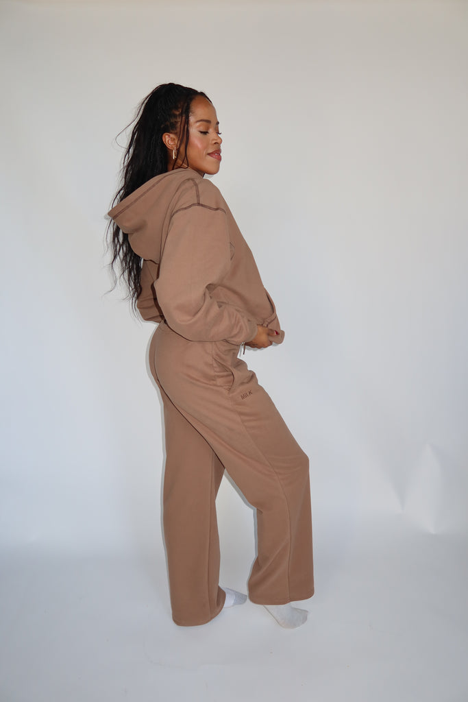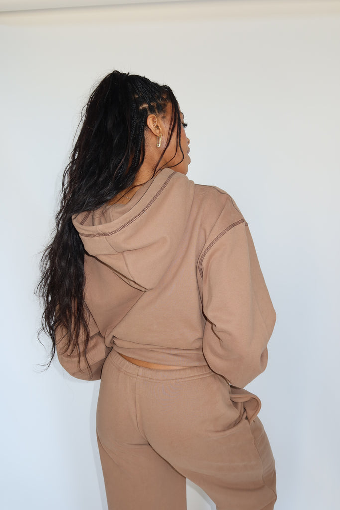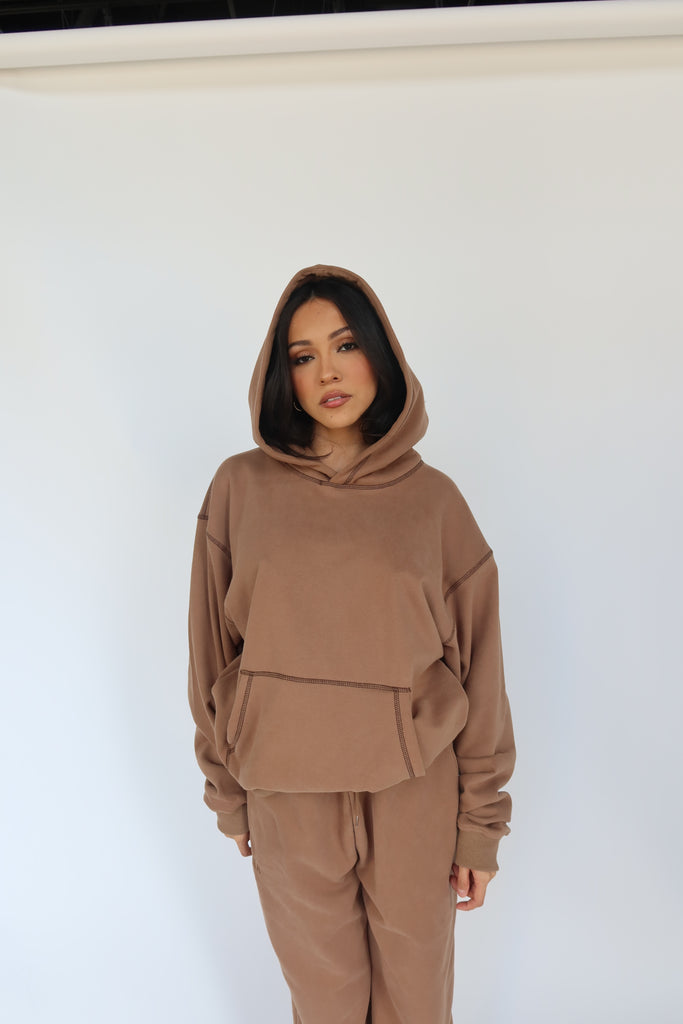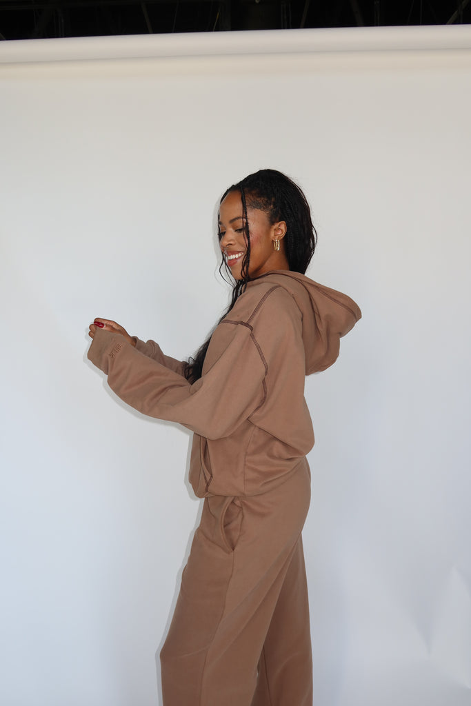 MODEL WITH HOOD OFF IS WEARING SMALL BOTTOMS MEDIUM HOODIE (5'9) MODEL WITH HOOD ON IS WEARING SMALLL BOTTOMS LARGE HOODIE (5'4)