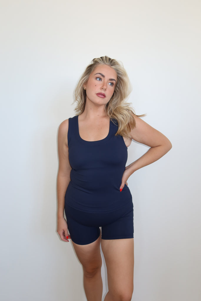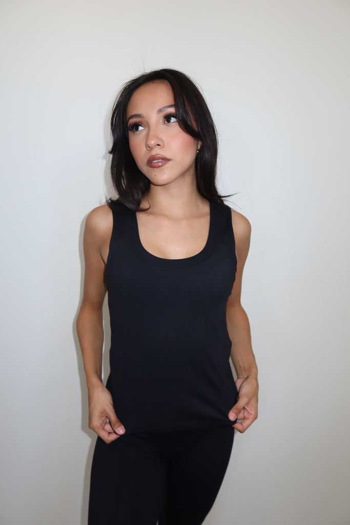 This tank was designed for a bustier girl to feel slimmed and held in. The bottom part of the tank is a looser fit to hide the pooch. The thick straps are comfy and slim the shoulders.