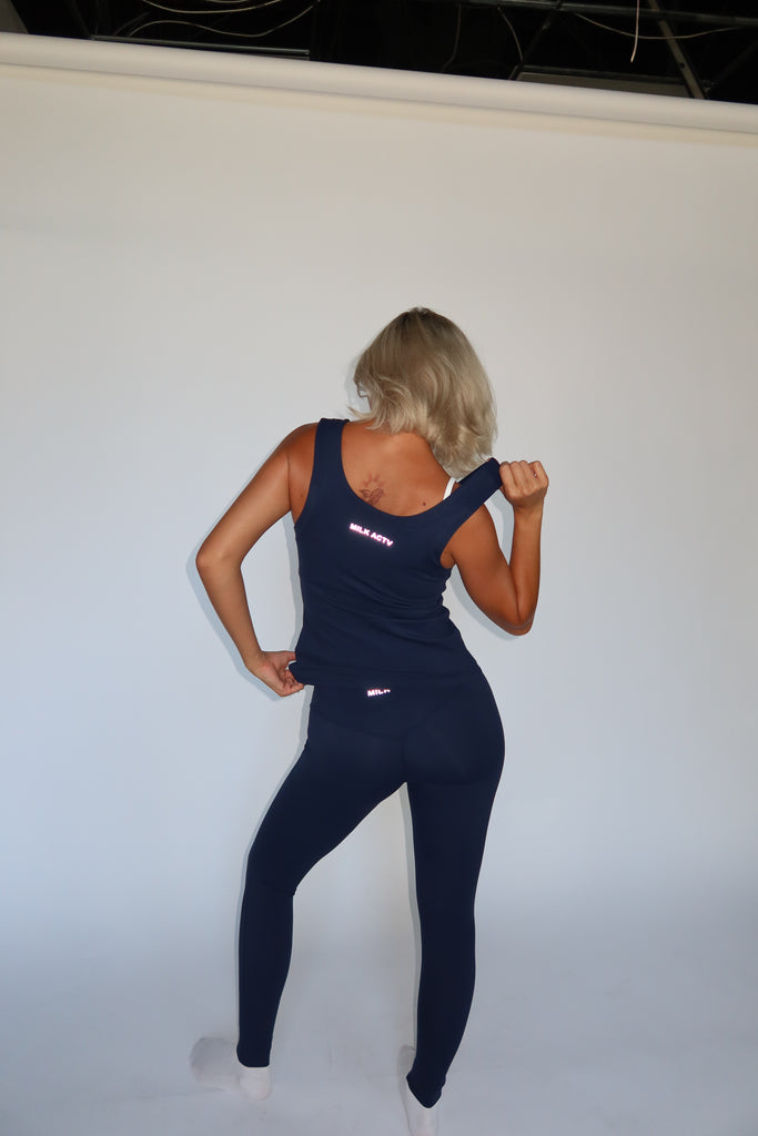 Model in navy is wearing medium top small bottom. Model in stone is wearing medium bottom small top. Model in black is wearing small top and bottom. Other Model in navy is wearing large top xl bottom.