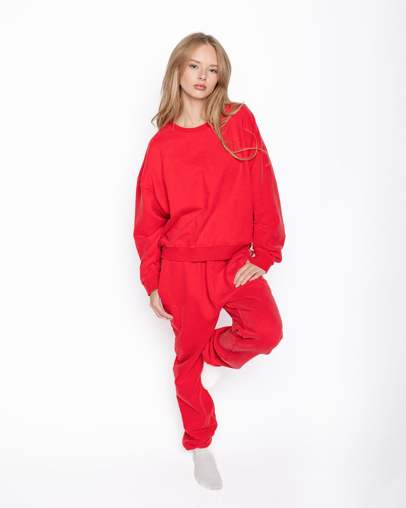 These Sweats run true to size with an oversized feel (so if you stay at your normal size, it it will still feel perfectly oversized)- but we recommend sizing up for a baggier look.