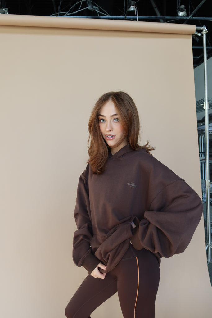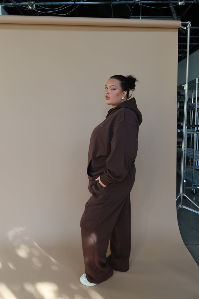 MODEL WITH RED HAIR IS WEARING SMALL BOTTOMS LARGE HOODIE