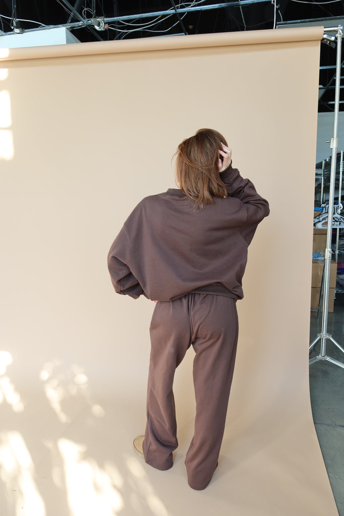 MODEL WITH RED HAIR IS WEARING SMALL BOTTOMS LARGE HOODIE